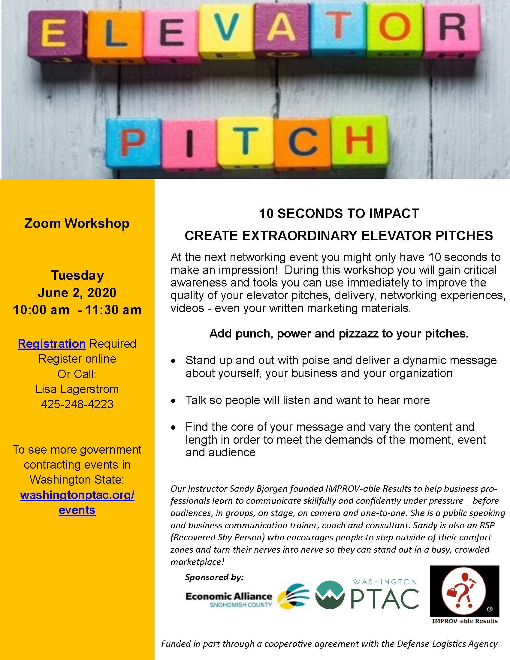 At the next networking event you might only have 10 seconds to make an impression! During this workshop you will gain critical awareness and tools you can use immediately to improve the quality of your elevator pitches, delivery, networking experiences, videos - even your written marketing materials.